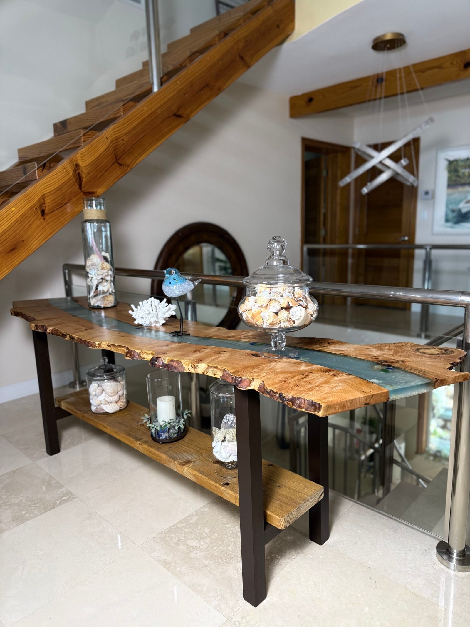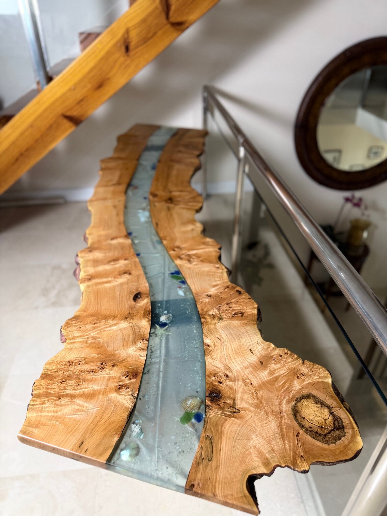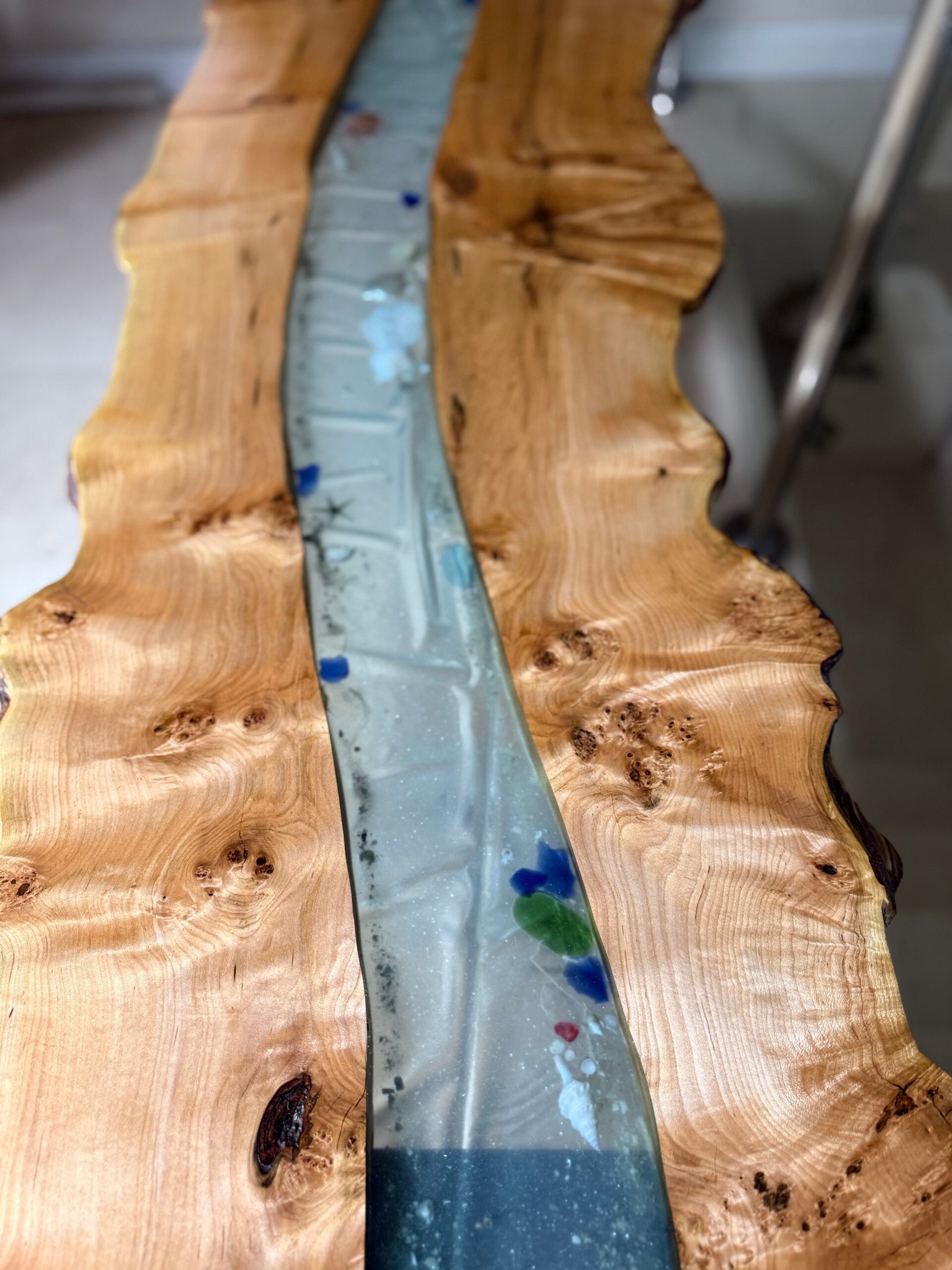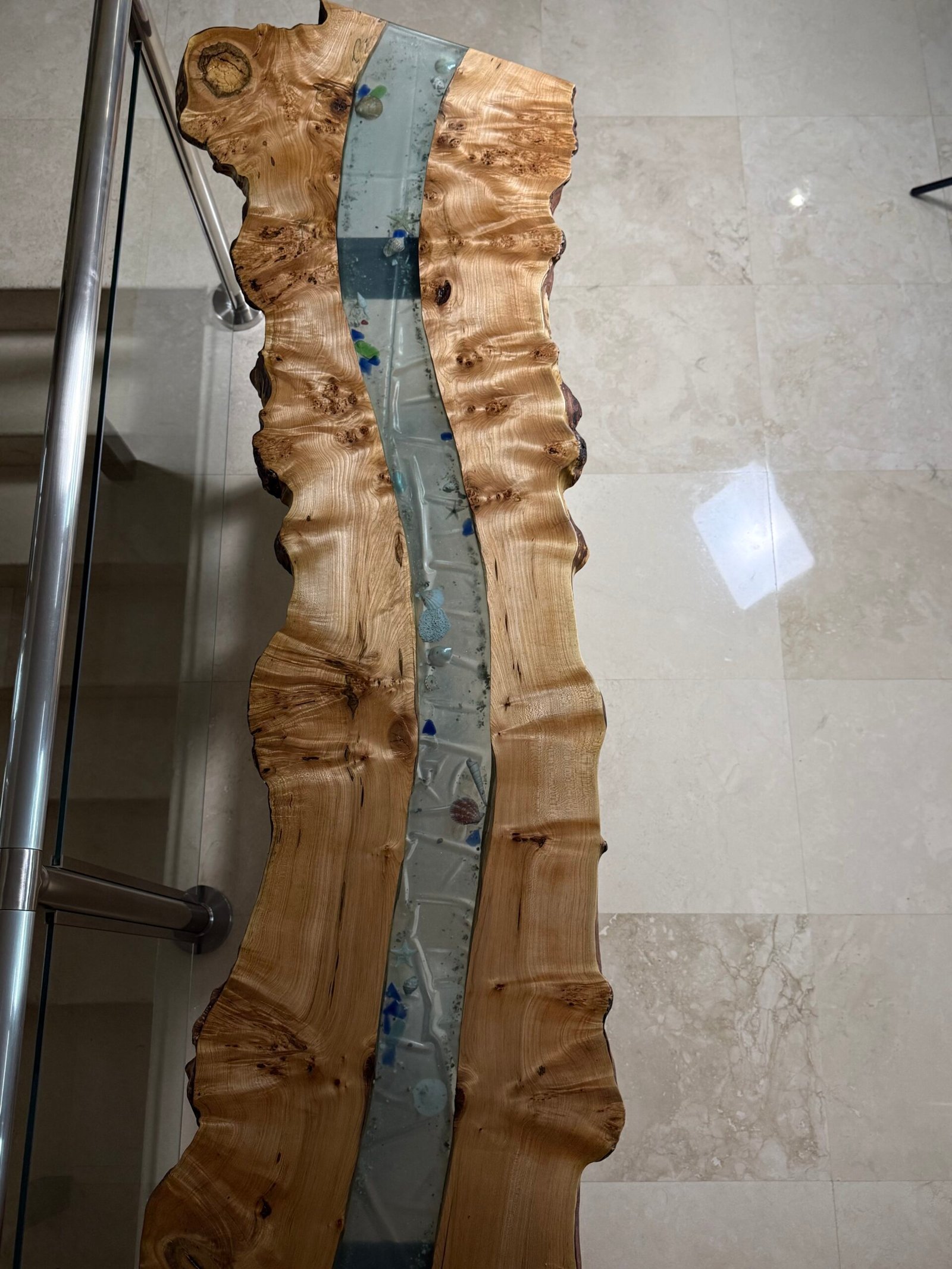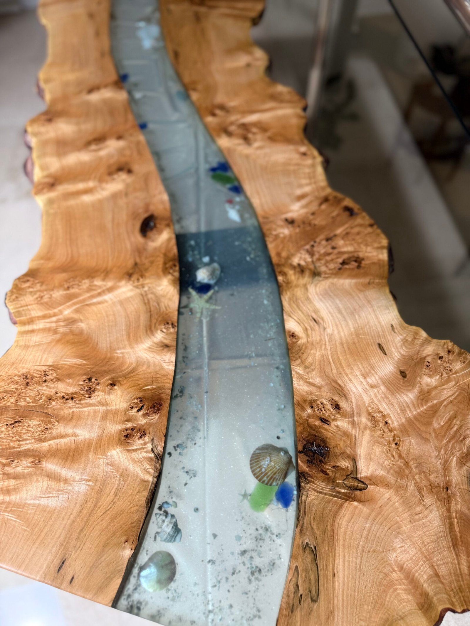 Burly maple live edge and transparent light blue epoxy with sand, shells and beach glass.