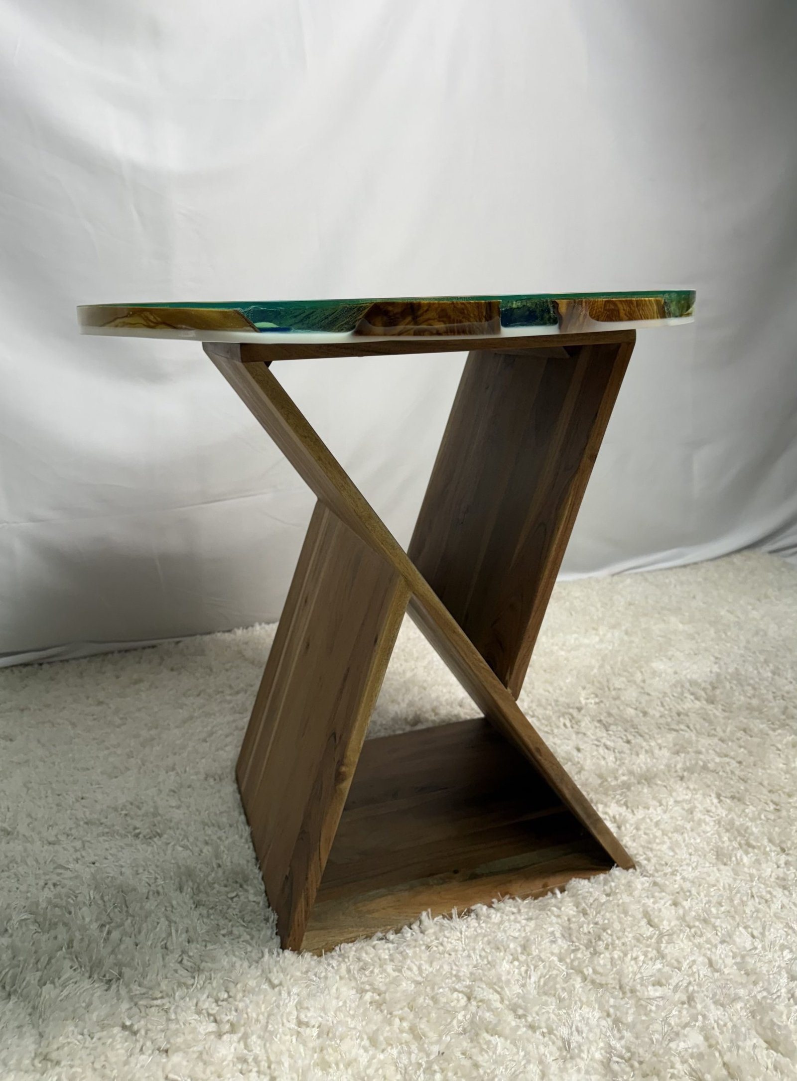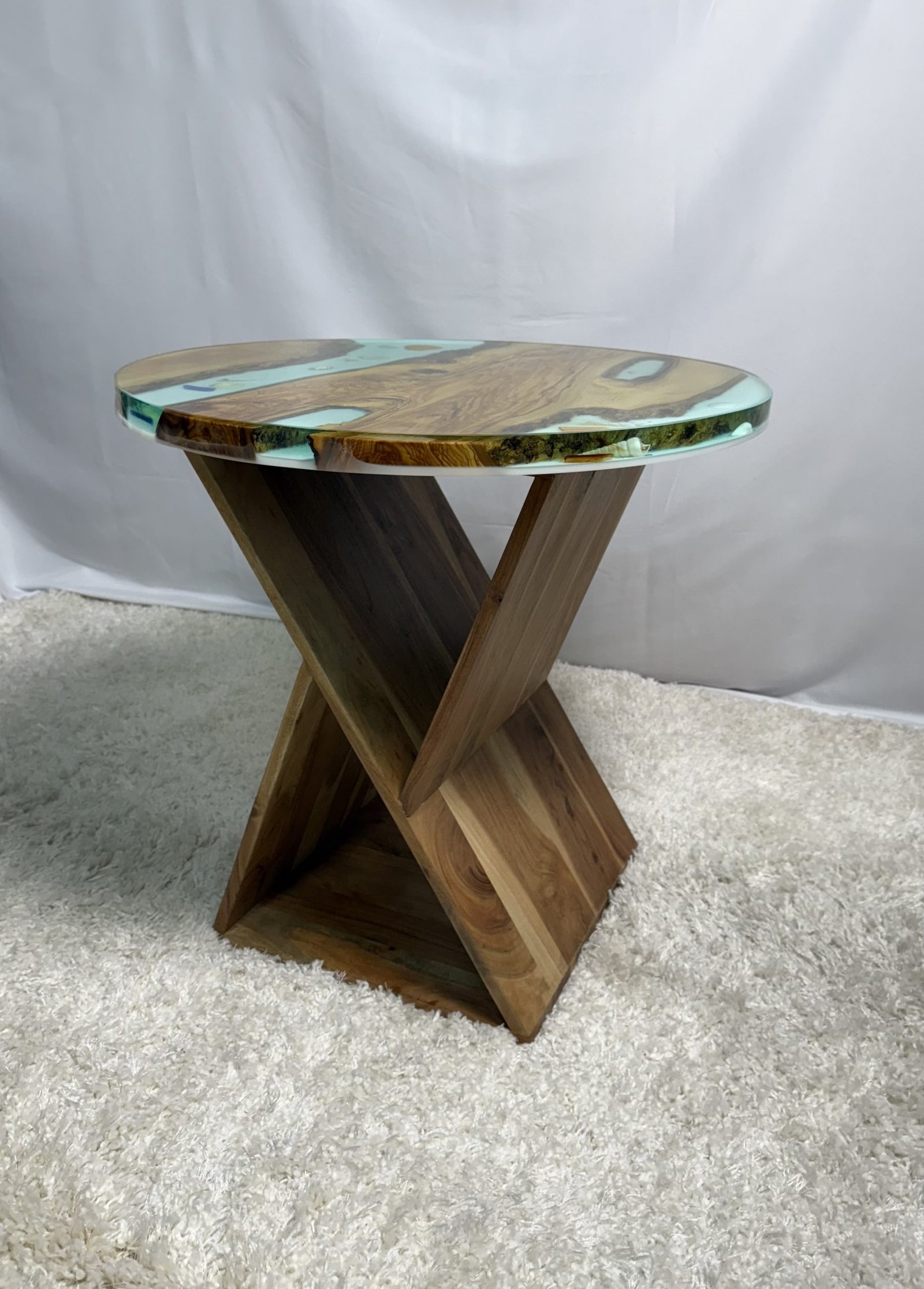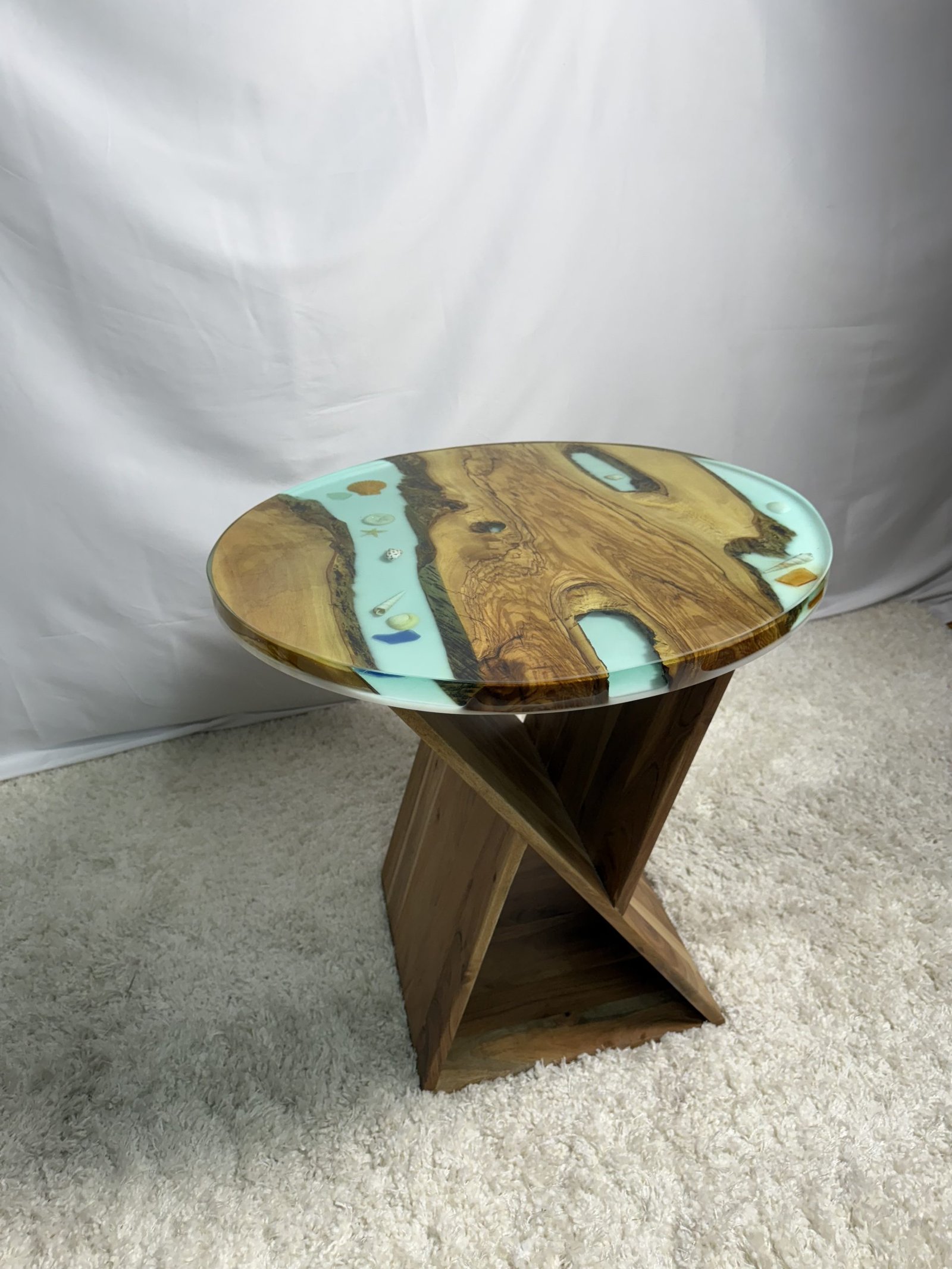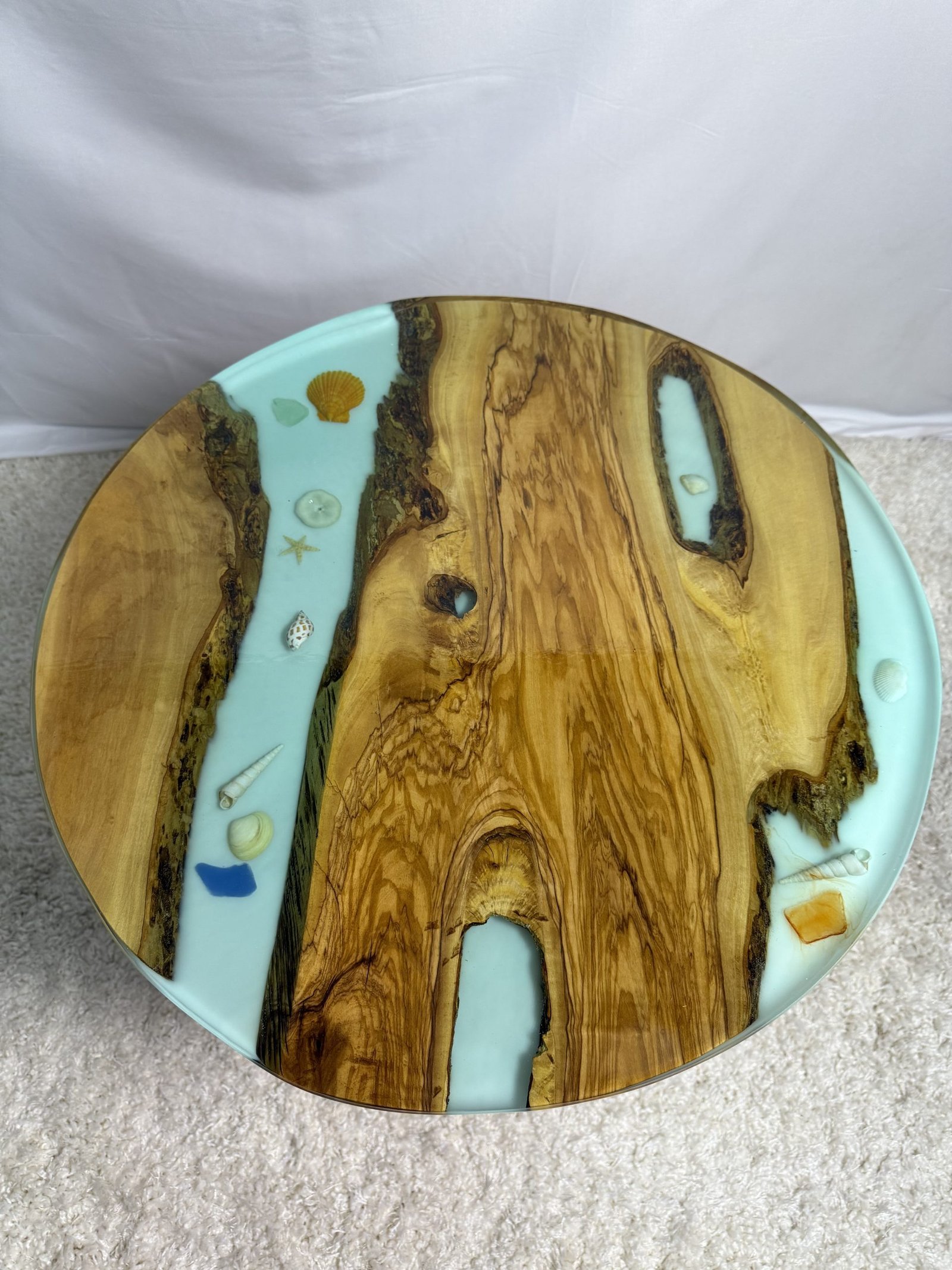 Round Olive Table With Ocean Floor Blue Epoxy